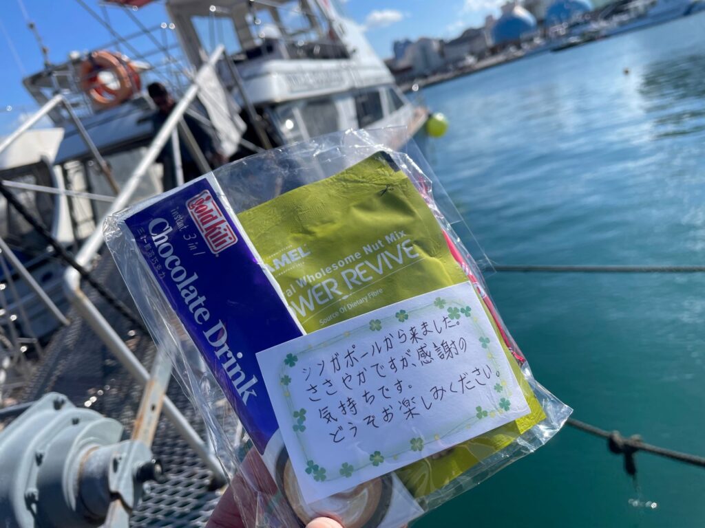 先日ホエールウォッチングにご参加いただいたお客様から、なんとサプライズでお菓子の差し入れをいただいたんです!
