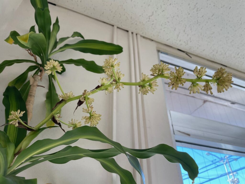 「数年に一度しか咲かない」なんて言われることもある幸福の木ですが、ショップの木はすっかりこの場所が気に入っているのか、毎年恒例の行事になっています(笑)